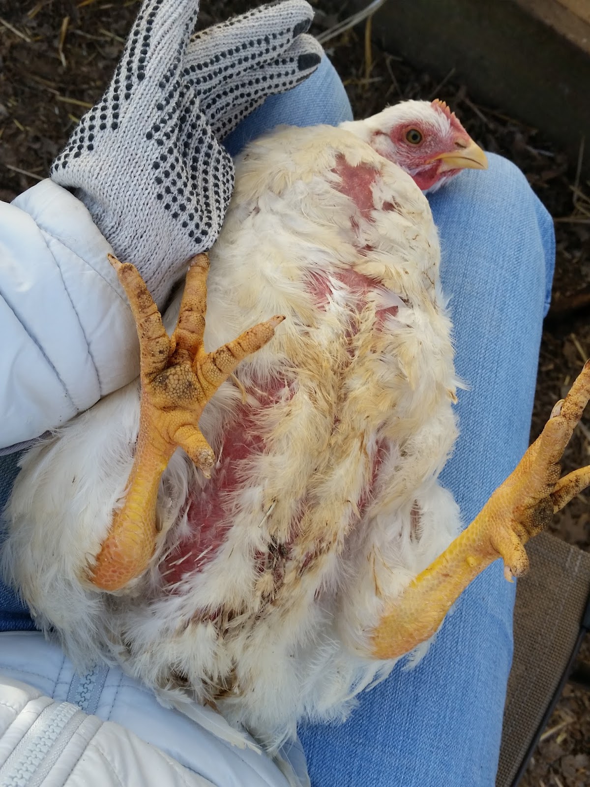 She seems protective of the other chicks. I've noticed she will sit in the entry of the small coop they were in between them and my older hens, who are peckish with the young ones. I have to babysit if they have access to each other right now. She's just lovely and very big. Being a meat bird means she's bred to gain weight rapidly. She's up to about 11 pounds now, but amazingly, the feathers on her belly and bum are grown in now, for the first time. I think she's doing well. Her waddle is entertaining as hell, but she seems healthy.
